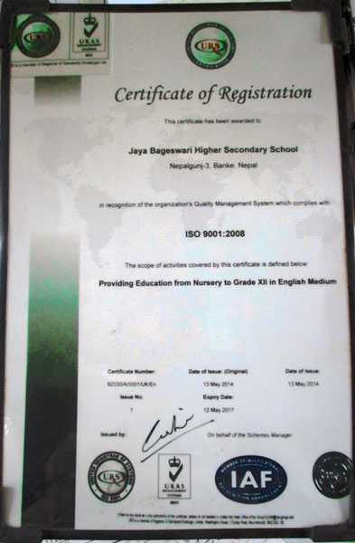 School is ISO Certified. The schoolis one and only school in West Nepal to get ISO certification.